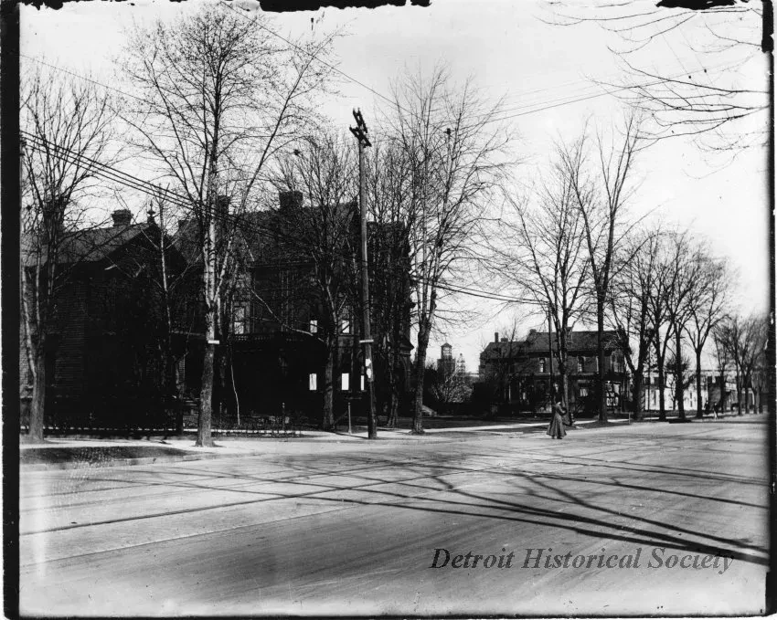 Black and white street view photograph from a glass plate negative of the west side of Woodward Avenue between Antoinette and Burroughs. A woman is visible in the right central middle ground crossing the avenue. Residential structures are adjacent to Woodward, separated by large foliage and power lines. The Cadillac Motor Car Company water tower is visible in the far background. Written on the verso, "West side - Antoinette to Burroughs (lower half), Cadillac Motor Car Company Tower on Cass near Burroughs in background."