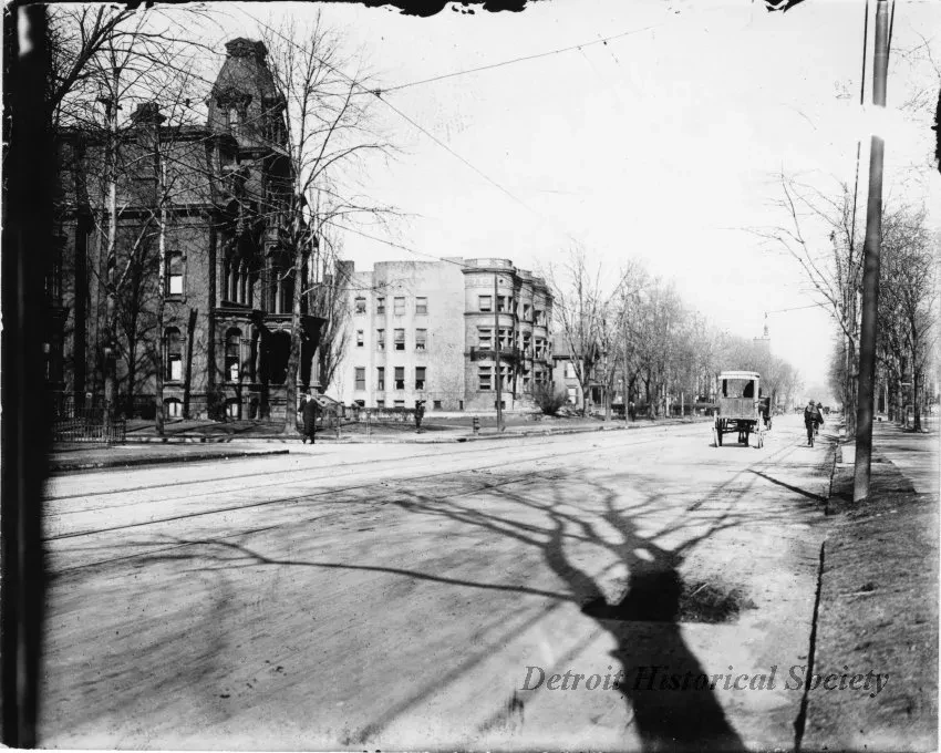 Print. Black and white street view photograph from a glass plate negative of the west side of Woodward, looking north, between Peterboro and Stimson. Woodward Avenue is visible in the foreground, including the shadow of a tree and street car tracks. A horse carriage and bicyclist make their way northbound on the thoroughfare. Neighboring the avenue is a residential home in the Second Empire style, in the left foreground, and an apartment building in the Romanesque architecture style. Pedestrians are visible walking the sidewalk along Woodward. Written on the verso, "West side of Woodward, looking north, between Peterboro and Stimson."
