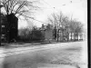 Black and white street view photograph from a glass plate negative of the west side of Woodward Avenue looking north between Hancock and Warren as written on the verso. A woman is pushing a baby carriage down Hancock toward the large multiple resident structure. Also adjacent to Woodward are two residential structures and a commercial structure in the distance. Written on the verso, "Woodward at Hancock, N.W. Corner."