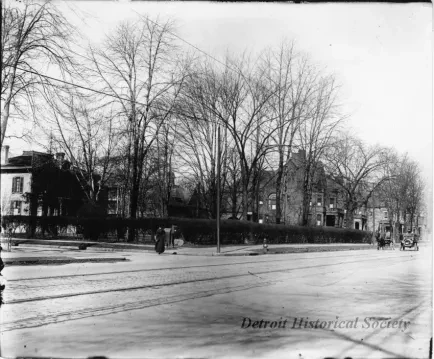 Black and white street view photograph from a glass plate negative of the west side of Woodward Avenue looking north between Stimson and Davenport, as noted on the verso. Street car tracks are visible in the foreground of the thoroughfare; a woman is crossing Stimson, as she walks down Woodward Avenue. A horse carriage is traveling on Woodward, next to it is an automobile. Several residential structures in varying architectureal styles are also near the thoroughfare. Also written on the verso, "N.W. corner of Stimson and Woodward."