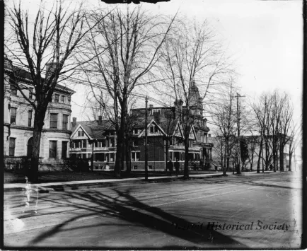 Black & white photo depicting houses on the west side of Woodward Avenue at Ferry Street. To the left is the George L. Beecher House. The Second Empire house in the background is the Wilhelm Boeing residence.