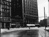 Black and white street view photograph from a glass plate negative of the north side of Michigan Avenue, Griswold to Woodward, looking east as noted on the verso. A woman is visible walking down the middle of the street toward the commercial buildings; automobiles and horse carriages are parked adjacent to the sidewalk along Michigan Avenue. The Majestic Building, Baltimore Lunch and the Home Savings Bank are visible neighboring the thoroughfare.