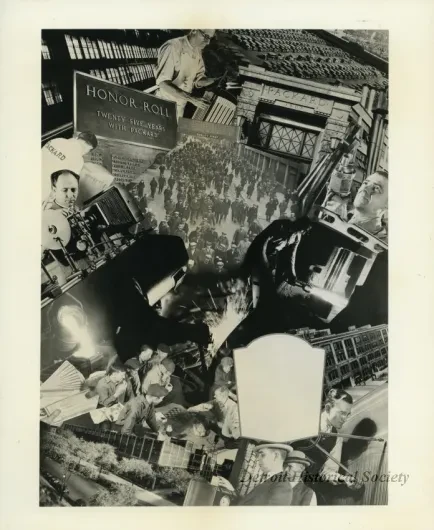 Request ImageBlack and white photographic collage featuring the Packard Automotive Plant.