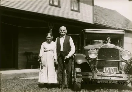 Black and white photographic print of Gratia and John Wilder standing next to a Packard automobile in Plymouth Notch, VT.