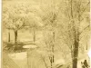 Mounted sepia-tone photographic print depicting the west side of Grand Circus Park covered in snow, as viewed facing north toward West Adams Street. The statue of Hazen S. Pingree is at the lower right corner. Part of the Fine Arts Buildings in visible in the upper left. The photo is mounted on thick cardstock.