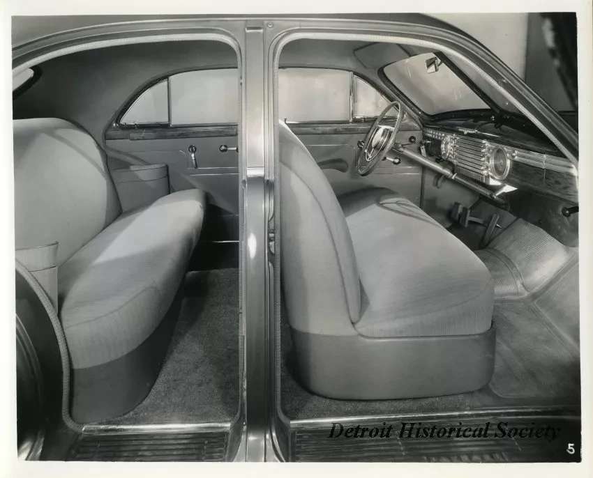 Black and white photographic print of a side view of the interior of a Packard Motor Car Co. automobile, taken from the exterior of the Packard's right side with the doors open.