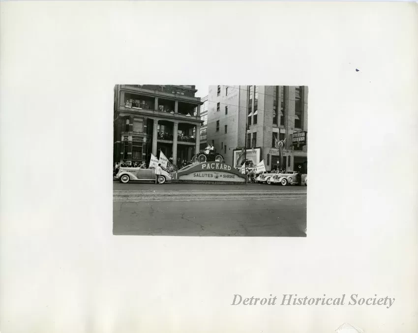 Black and white photographic print showing a Packard Motor Car Co. parade heading southwest on East Jefferson Avenue. The parade float featured in the photograph features an 1899 model Packard, with a man and a woman sitting inside, atop a platform reading "Packard Salutes the Shrine." The float contains four flags, one at each corner, featuring the names of various Packard models. Three later model Packards can be seen around the float, with one in front and two behind. Many people are shown watching the parade along the side of Jefferson Avenue and on the balconies of the building in the back left. The building in the back right, 2751 Jefferson East, has a sign reading "Barnes Press Color Printers." An advertisement for the Lincoln Zephyr V12 is on the side of said building.