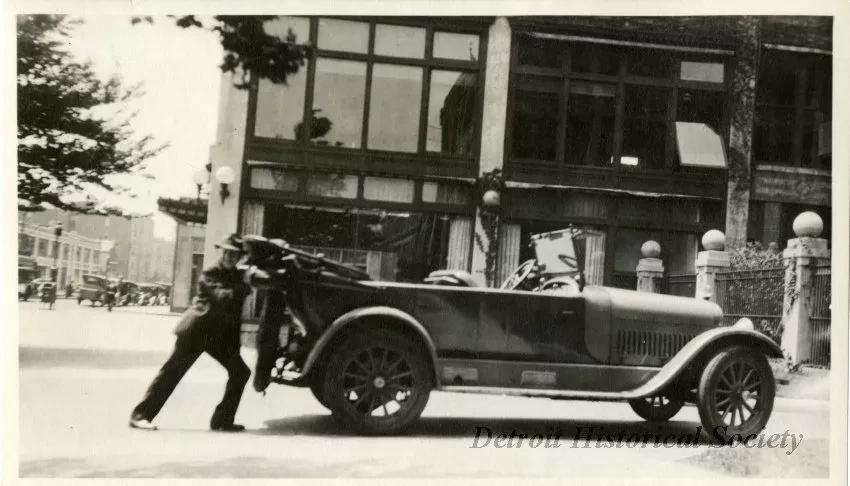 Black and white photograph showing Fisher Pearson, Packard Motor Car Co. sales associate from Boston, pushing a Packard Motor Car Co. automobile. The Packard is shown with a right side profile view.