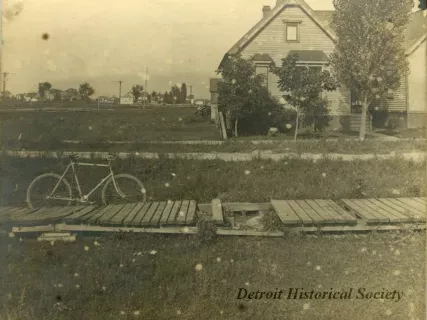 Sepia-toned photograph, mounted on board, of a plank constructed sidewalk on High Street. Two young men are near the sidewalk on a stoop of an adjacent house in the background. Written in script on the verso, "Apr 14th 1902, Mrs. Rosa Simmons, In front of 346 High Street E. Looking west. F.S.Q."