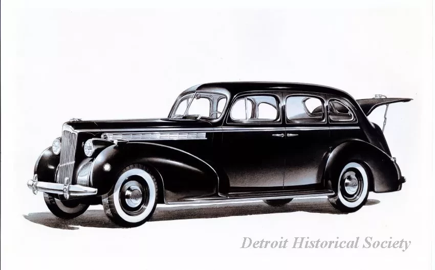 Retouched photographic print depicting full length angled side view of the Packard 8 Touring Sedan.