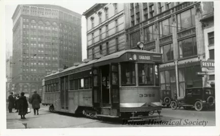 Black and white photo of Department of Street Railways streetcar number 3352 headed east along Cadillac Square, taken facing the northwest. The car's destination sign is set to "Gratiot." The Real Estate Exchange Building and the Second Williams Block stand along the edge of the square on the right. Signs for Joseph J. Jacobson and Company, and the Detroit Mortgage Corporation are posted in the Cadillac Square Building's windows. The Majestic Building stands in the background on the left, across Campus Martius. A traffic tower topped with a traffic light is visible in Campus Martius.