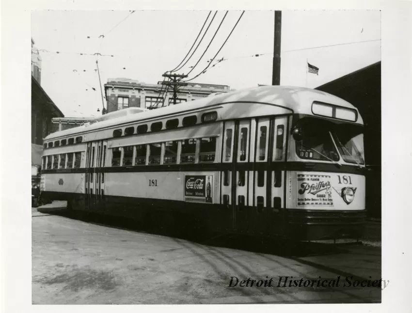 Black and white photo of Department of Street Railways streetcar number 181. The car's destination sign is set to Woodward Avenue, and advertisements for Coca-Cola and Pfeiffer's Beer are posted on its side and front.