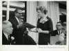 Black and white photographic print taken at the 40th Anniversary Banquet of the Great Lakes Mutual Insurance Company on March 29, 1968 at the Veterans Memorial Building, depicting a plaque being exchanged between Doris Pelham and an unidentified man. Thaddeus B. Gaillard and Dr. Benjamin Mays look on from the right side of the photograph, as does Alfred Pelham from the lower left. "F-11" is handwritten on the verso.