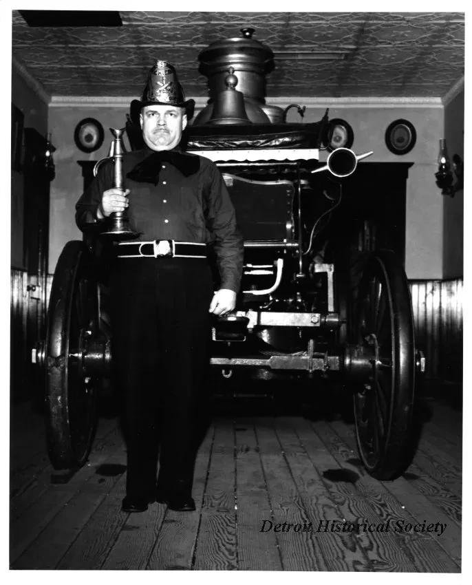 Photograph. Black and white glossy photo showing a man who is wearing an early fireman's uniform (c. 1890) and is standing in a stiff pose in front of steam fire engine. He is also wearing an assistant fire chief's helmet and is holding a speaking trumpet. Interior furnishings of the fire station are visible in the background. A red ink stamp on the verso shows "Official D.F.D. Photo, by Insp. J. A. Mancinelli, Date: Jan 16, 1963."