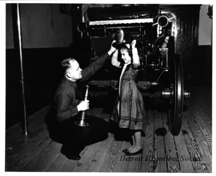Photograph. Black and white glossy photo showing a fireman who is helping a young girl place a fire helmet on her head. Both the fireman and the girl are dressed in clothing that would be typical of the time period around 1890. A steam engine truck is visible in the background. A red ink stamp on the verso shows "Official D.F.D. Photo, by Insp. J. A. Mancinelli, Date: Jan 16, 1963."
