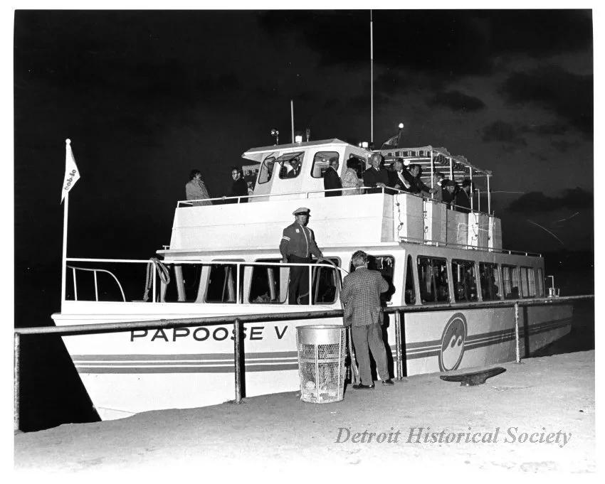 Black and white photographic print of the Bablo ferry the PAPOOSE V, docking along the ferry docks on the south side of Belle Isle near the Dossin Great Lakes Museum; passengers are attendees of the Midwest Museum Conference. Handwritten on the verso, "Midwest Museums Conference, Sept. 1971." Also, the name of the photographer is stamped on the verso, "Photo by Harry J. Wolf, 1686 Evans Ave., Detroit 9, Mich."