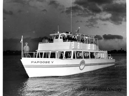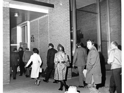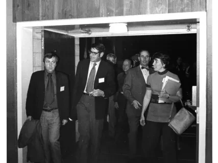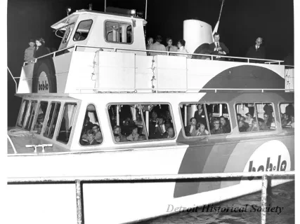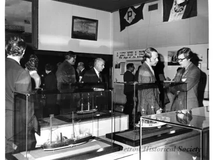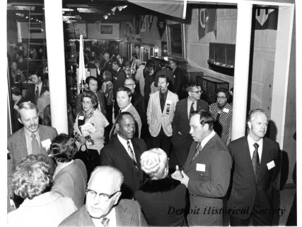 Black and white photographic print of the Midwest Museum Conference attendees partake in Friday evening dinner in DeRoy Hall, at the Dossin Great Lakes Museum. Many of the attendees are looking out the large windows toward the Detroit River, on the left side of the hall. Typed on the verso, "Midwest Museum Conference, Sept. 1971." Also, the name of the photographer is stamped on the verso, "Photo by Harry J. Wolf, 1686 Evans Ave., Detroit 9, Mich."