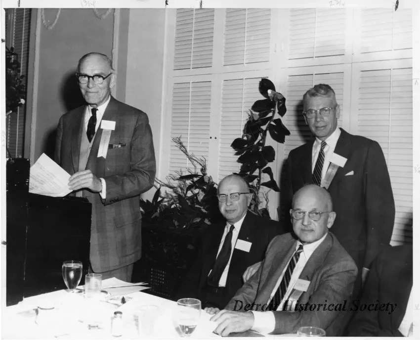 Black and white photographic print of (left to right) Ben R. Marsh, Chairman; Hon. Joseph M. Dodge, Speaker; Harold M. Hastings, DHS President; and in the rear - Gustave A. Wellensick, whom are in attendance at the 1956 Business Founder Dinner, held on May 4th.