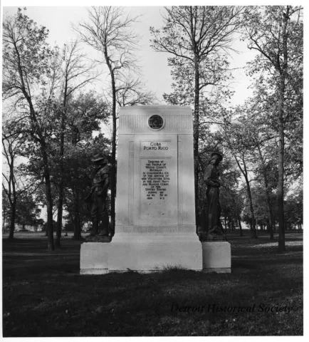 Black and white photographic print depicting the Spanish American War Memorial on Belle Isle. The inscription reads, "Cuba, Porto Rico, Erected by the People of Wayne County Michigan In Commemoration of the Service of Her Volunteer Sons in the Army, Navy and Marine Corps of the United States During the War With Spain. 1898-1902."