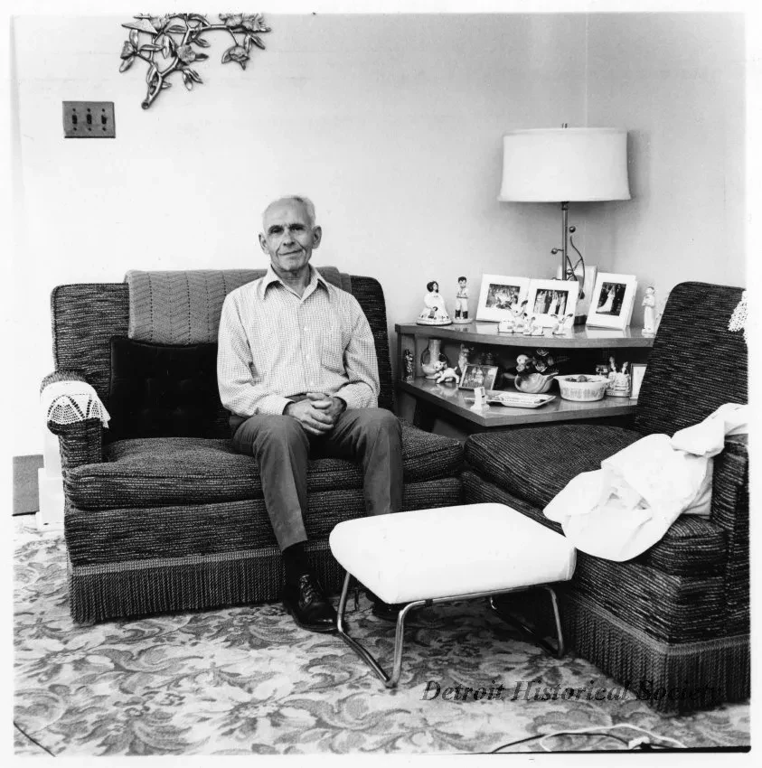 Black and white oversized photographic print mounted on board depicting a Romanian man sitting on a loveseat in a living room. A second loveseat is partially visible on the other side of a table filled with framed photographs and figurines.