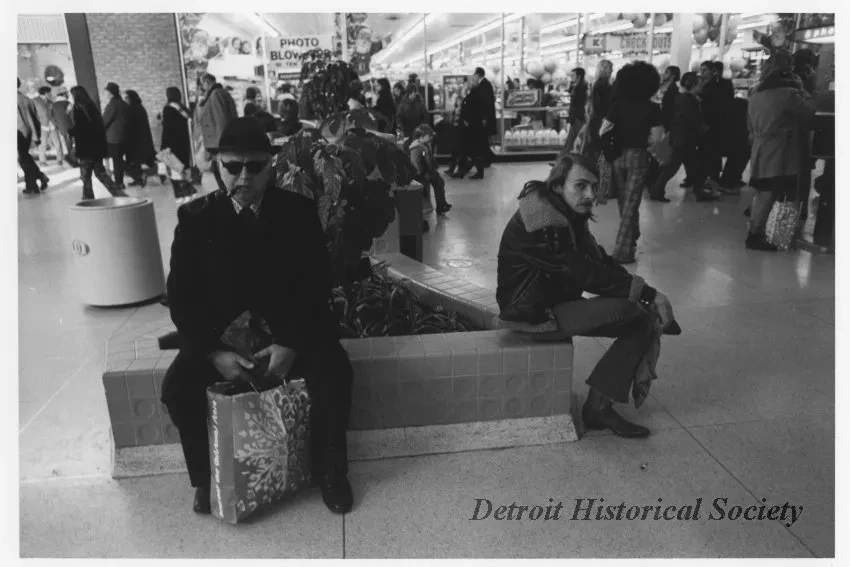 Black and white photograph print of two men seated on a triangular, tiled planter, inside a mall, and outside of an entrance to the S.S. Kresge Co., retail location. The man on the left is dressed in a hat, sunglasses, a suit with necktie, and has a pipe in his mouth; he also has a Hudson's Christmas Store shopping bag positioned between his feet. Right of him is a younger man, dressed in leather boots, flared pants, and a leather jacket with a large collar. Shoppers mill about around the seated me.