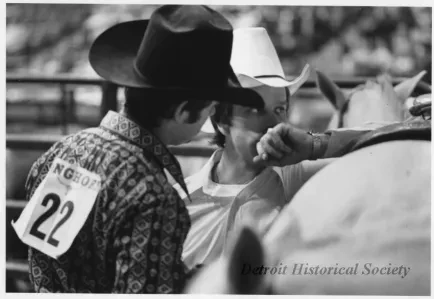 Black and white photographic print of two rodeo cowboys conversing at a point in the competition; at the World Championship Rodeo held at the Michigan State Fair. Handwritten on the verso, "World Championship Rodeo - Michigan State Fair Grounds - April 26, 27, 28, 1973."