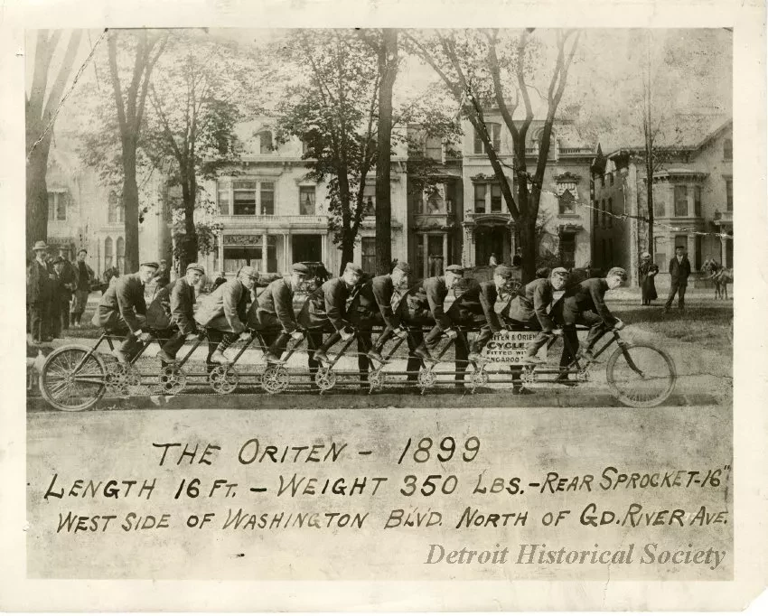 Photograph. Sepia-toned photo of ten men riding a tandem bicycle. A sign at the front end of the bicycle notes "Oriten & Orient Cycles Fitted with Kangaroo Tires." A label along the bottom of the photo notes "The Oriten - 1899; Length 16 Ft. - Weight 350 Lbs. - Rear Sprocket-16"; West side of Washington Blvd. North of Gd. River Ave." A typewritten and handwritten label on the verso notes "West side of Washington Ave., north of Grand River Ave., Detroit, Mich. Date about 1899. From front to back: 1. Freeman A. Monroe, 10325 S. Morrow Circle, Dearborn. 2. Harry D. Chapman, 78 Oakdale Blvd., Pleasant Ridge. 3. Wm. A. Chapman - deceased. 4.Robert Seebaldt 5. Sidney Sanford, 8431 Oakland Ave. 6. Charles S. Monmier, 431 Hague. 7. Oscar Wanderer, died about 1918. 8. - 9. - 10. - " and "Gift of Morris Bamler 1970."