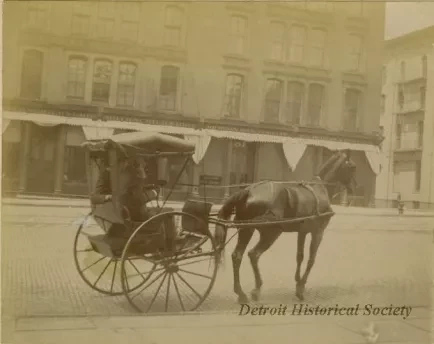 Sepia-toned gelatin silver photo showing two men who are riding in a covered buggy that is being pulled by one horse. The men's faces are not visible. The curb and brick street pavement can be seen in the foreground and several brick buildings can be seen in the background. Business names that are visible include: Rothschild & Bro., Michigan Shoe company, and W. A. McGraw & Company. The address numbers, "81" and "83," are visible on the store awnings. Handwriting below the photo notes "77-83 E. Jefferson, 1897." A second photograph is glued to the verso. This sepia-toned photo shows an older woman, a younger woman, and two children who are seated indoors at a dining table. The photo is very overexposed so it is difficult to see details of their faces. The second photo was likely taken about the same time as the first one, c.1897.