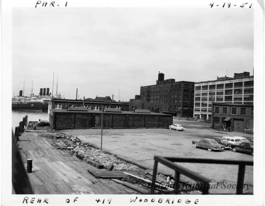 Black and white photograph of the riverfront, docks, and industrial area. Visible in image are docks adjacent to the river; storage sheds, and manufacturing warehouses. Located in the background are three Detroit and Cleveland Navigation Company steamships and the Michigan Central Third Street Station.