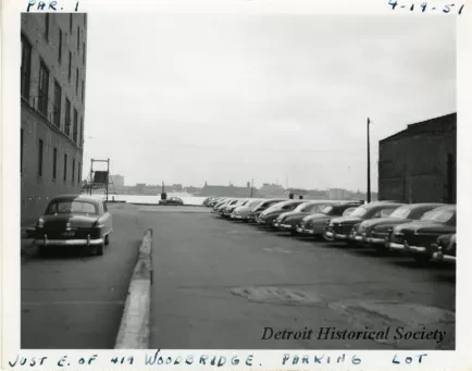 Black and white photograph of a parking lot at the riverfront, taken facing the river and Windsor. The lot is filled with cars. Large brick buildings border the lot on the left and right. "Par. 1 4-19-51, Just E. of 419 Woodbridge Parking Lot," is handwritten in ink around the border on the recto.