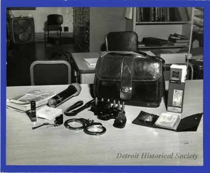 Photograph. Black and white photo showing a policewoman's equipment kit. The various items are arranged on a desktop and include: a purse, handheld radio, badge and identification wallet, revolver and bullets, handcuffs, small nightstick, flashlight, whistle, street map, compact and lipstick. The name on the identification card shows "Detroit Police Department Policewoman, Virginia N---ian."