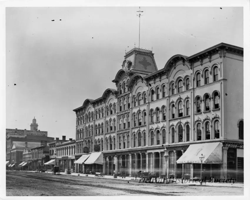 Black and white photographic print depicting the Godfrey Block and several adjacent storefronts on Woodward Avenue, near Gratiot Avenue. The visible businesses along this row include John Harvey, Drugs and Medicine; D.M. Ferry and Company; William C. House and Company; Pixley and Cleveland, Mattresses, Bedding, and Furniture; a sewing machine store; a book binder; Freedman and Brothers; and the Weber Furniture Company's Warehouse. A horse-drawn wagon and carriage are stopped along the sidewalk. "1870's" handwritten on verso, along with "M-1847-6" in pen and "Dept. Report & Info. Comm." stamped.