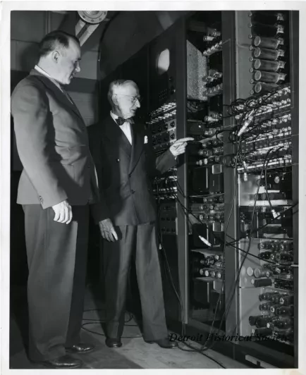 Black and white photographic print depicting Thomas E. Clark and E.J. Love posed next to a wall covered with racks of broadcasting equipment at WWJ. Both men wear suits, and Clark points to an array of vacuum tubes.