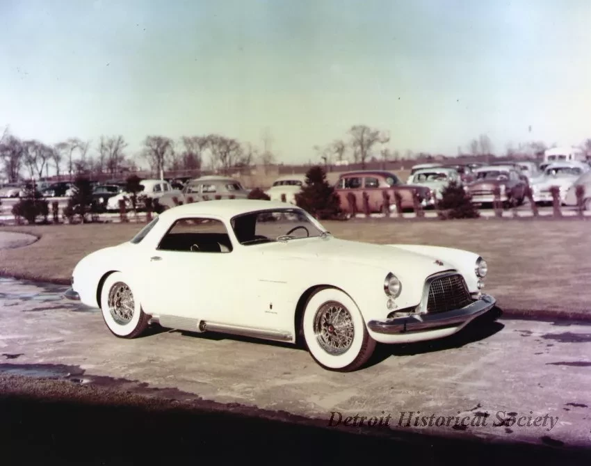 Color print of a white 1954 Chrysler De Soto Adventurer. The front and passenger sides are visible, including the rounded grill, whitewall tires, and side exhaust. The car is sitting on pavement with other cars visible in the background.