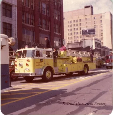 Color semi-gloss photograph of a Detroit Fire Department pumper truck that is moving in a parade of fire department vehicles on Woodward Avenue. Several downtown buildings can be seen in the background including the Detroit Institute of Technology. The ladder truck in the center of the photo is painted bright yellow. "Detroit Fire Department" is shown in gold-colored lettering on the driver's side door and also the number, "22." Two firemen in uniforms are standing on the truck. Handwritten text on the verso shows "Detroit, Mich., L[Ladder].22, 1974 Seagrave 100' Diesel, 300 g."