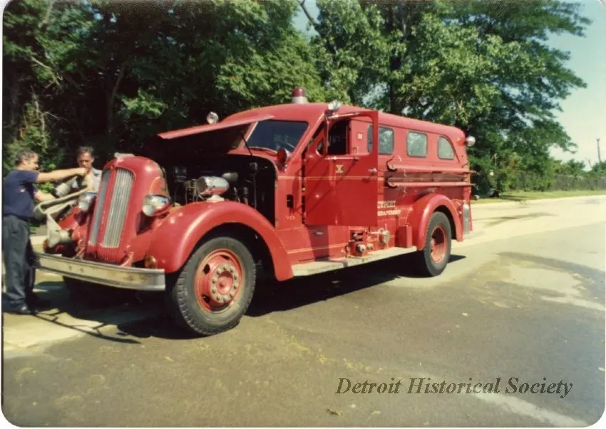 Color semi-gloss photograph of a Detroit Fire Department pumper truck that is parked along a secondary road in front of a group of large trees. The fire truck is painted red and "Detroit Fire Department" is shown in gold-colored lettering on the side along with the Roman number, "X," on the driver's side door. The left side hood over the engine is open and two firemen appear to be re-coiling hose near the right front corner of the truck. Handwritten text on the verso shows "Detroit, F-26, 1950 Seagrave, 1000 gpm." and "4-36, Mutza." Additional handwritten text notes: "Seagrave used 'waterfall grille' 1937-1951."