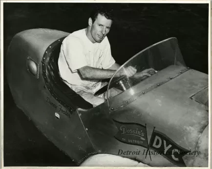 Photograph. Black and white photo showing the driver, Danny Foster, seated in the cockpit of the hydroplane, "Miss Peps V." The deck and sides of the hydroplane are painted white. Painted lettering and graphics on the sides of the hydroplane show the name of the driver, "Danny Foster," a Pepsi Cola bottle cap, and the crossed burgees of "Dossin's of Detroit" and the "DYC [Detroit Yacht Club]."; mounted on board.