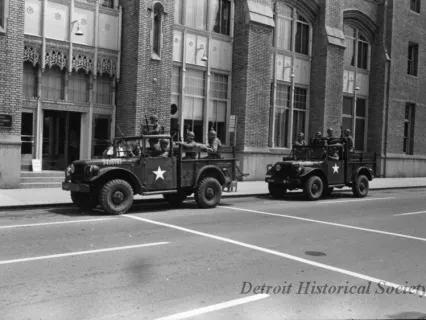 Print. Black and white photographic print of a man wearing a necktie standing next to an Army truck carrying two soldiers of the 46th Infantry Division, one a sergeant. The truck is parked in front of a brick building with a sign reading, "2000 Second Avenue, The Detroit Edison Company, General Offices."