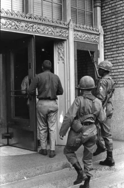 Print. Black and white photographic print of two soldiers, one of whom can be identified as a Staff Sargent in the Army's 82nd Airborne Division, following three civilians into the Detroit Edison Company General Offices on Second Avenue.