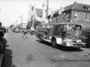 Print. Black and white photographic print depicting a scene of West Chicago Street, facing west, at Livernois Avenue. Parked on the street are several Detroit Fire Department ladder trucks and many people, some of them soldiers. Visible on the north side of the street are a fire station, a parked Salvation Army truck, Hope Lutheran Church, and a "Thrift Store" on the corner of Stoepel Avenue.