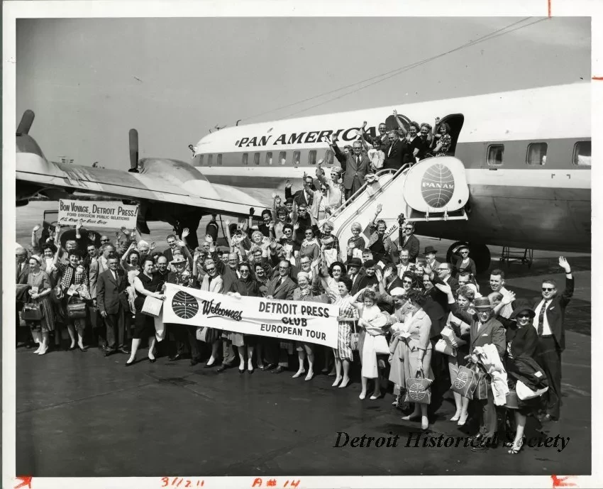 Black and white photographic print depicting a Pan American propeller airplane sitting on the tarmac, with a crowd of people waving from behind a banner reading "Pan Am Welcomes Detroit Press Club European Tour." Another sign under the wing reads "Bon Voyage, Detroit Press! Ford Division Public Relations, P.S. Keep Our Boss Busy".