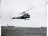 Black and white photographic print depicting a helicopter flying about 25 ft. above the ground at Willow Run Airport. In the background are three passenger airplanes, including one labeled "Capital Airlines" and one labeled "Fly Mohawk". Three separate areas of the image have been masked and airbrushed.