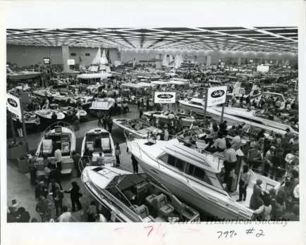 Black and white photo taken overlooking the Sea Ray display at the Detroit Boat Show in Cobo Hall. A wide variety of models of boats manufactured by Sea Ray are on display in the foreground. Signs for Boat Mart, Harbor Craft, Viking, Chris Craft, Wilson Marine, and Master Craft are visible in the background around the showroom floor. Several marking have been made in the borders in grease pencil and ink. A handwritten note on the verso indicates that the image was used in the January 1986 issue of "Michigan Living."