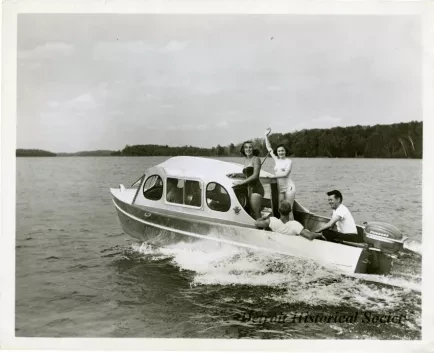 Black and white marketing photo of an Aerocraft JCC cabin cruiser, powered by an Evenrude outboard motor, taken from off its port quarter. A man steers the boat from inside the cabin. A boy is seated beside him. Outside the cabin two women in bathing suits look to the camera, as two men in t-shirts sit near them. "Raymond Schuessler, 28 Harmonia St. Buffalo, N.Y." is stamped on the verso.