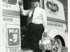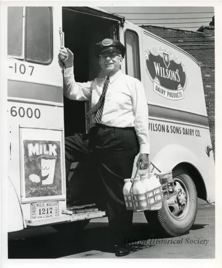 Black and white photographic print of a Wilson's Dairy deliveryman who is standing beside his truck while holding a basket of milk bottles and cottage cheese. The man is dressed in a long-sleeve white shirt, tie, and dark trousers, and is wearing a company cap. The Wilson's Dairy logo can be seen on the truck in the background. The license plate number, 1217, shows the year, 1960.