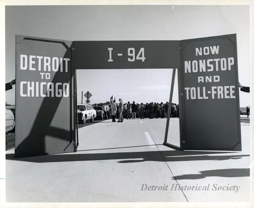 Photograph. Black and white photo of a large folding sign that shows "Detroit to Chicago, I-94, Now Nonstop and Toll-Free." The sign has been set up on the concrete highway pavement and has a large opening at the center which would allow a car to pass through. A large crowd can be seen in the background along with several parked cars. Presumably, this photo was taken at a dedication ceremony to celebrate the recent completion of highway reconstruction. A typewritten label on the verso shows "I-94, Detroit-Chicago, Automobile Club of Michigan, Nov., 78."