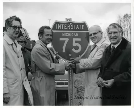 Photograph. Black and white photo of a dedication ceremony on Interstate 75 (I-75). Four men are standing on beside I-75 highway sign. The man on the far left might be James Moffat who was the general manager of the Automobile Club of Michigan. The man second from left is William G. Milliken who was the Governor of Michigan. The two men at the far right side of the photo are probably city or county officials, but their names are not known. A tank or armored vehicle and a young man can be seen in the left background area of the photo.
