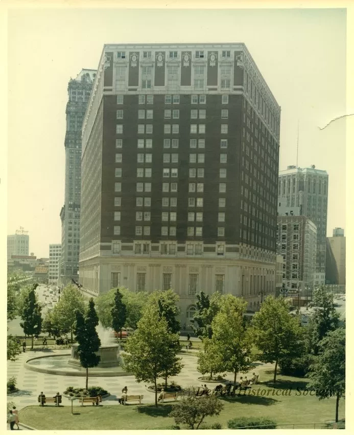 Color photographic print depicting the Hotel Statler from Grand Circus Park. In the background are the Free Press Building, Washington Boulevard, Book Tower, Michigan Bell Telephone Building, Bagley Avenue, the former Michigan Consolidated Gas Co. undergoing renovation. In the foreground is the Edison Memorial Fountain.