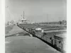 Black and white photo of the Colonial Steamships freighter JOHN E. F. MISNER passing through the Soo Locks. A man walks along the deck of the freighter toward the bow, passing a pile of bags. "University of Michigan, Audio-Visual Education Center, Administration Building, Ann Arbor, Michigan," is stamped on the verso.