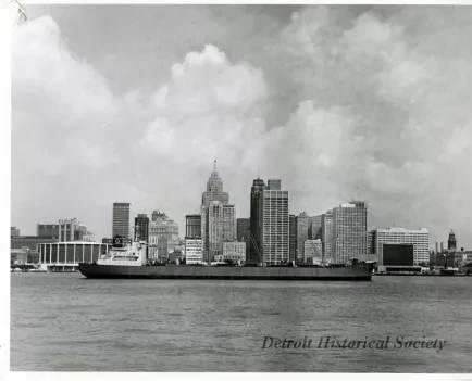 Black and white photograph of the ocean freighter OGDEN CLIPPER headed up the Detroit River with the skyline of Detroit in the background. The Manufacturers Bank of Detroit Building, Cobo Hall and Cobo Arena, the Michigan Bell Telephone Addition, 211 West Fort Street, the Pontchartrain Hotel, the Book-Cadillac Hotel, Book Tower, the Veterans Memorial Building, the Penobscot, the Buhl Building, the Standard Federal Savings and Loan Building, the First Federal Building, the Guardian Building, the Michigan Consolidated Gas Building, the First National Building, the City-County Building, Ford Auditorium, and the Wayne County Building all stand in the background. "Bert Emanule, photo," is handwritten on the verso.